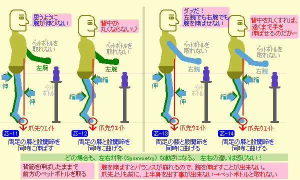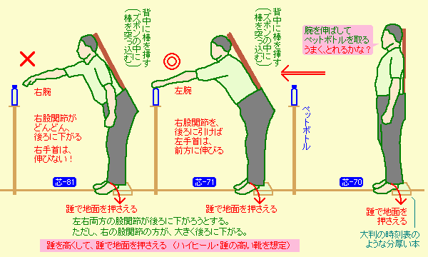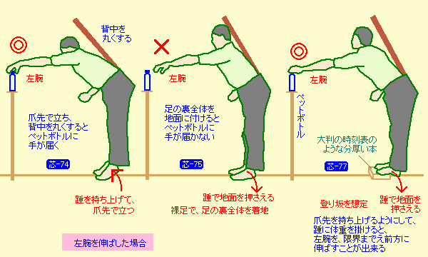 だけど、「踵を地面に付けて、踵で地面を押さえる」ときにも、ペットボトルを取ることが出来る。 左腕を伸ばすときには、むしろ「踵を地面に付けた時」のほうがカラダが安定する。