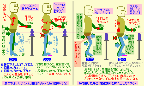 【芯-21)のように、ヒールのある靴を履き、両足の膝を伸ばした姿勢で左腕をどんどん前に伸ばすと、それに連動して、左(腕と同じ側)の股関節・左の骨盤・左の腰が、どんどん前に出て行きます。