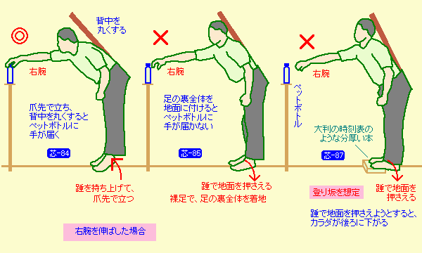右腕を伸ばして、ペットボトルを取ることができるのは、「踵を持ち上げた時」だけであり、「踵を地面につけたとき」には、ペットボトルを取ることが出来ない。