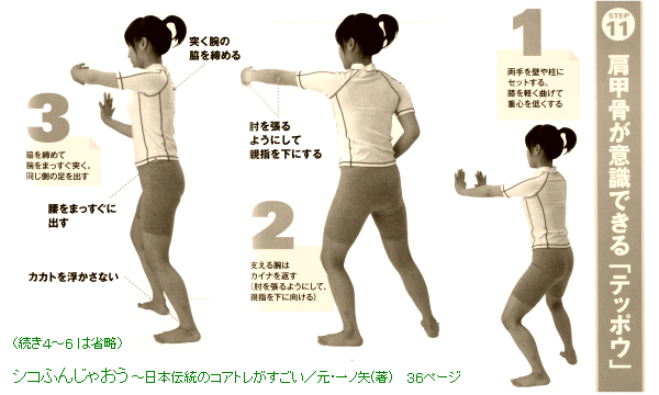 カイナを返す(肘を張るようにして、親指を下にして、腕を前に出していく)ことと、腰を後ろに引きながら重心を落とすことで、踵を浮かさないようにして、前進することが可能になるようです。