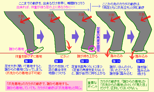 なので、カラダの動きを論じないで、ただ単に、「踵着地」か「爪先着地」かだけを論じるのは、まったく意味のない話であり、大きな誤解を招く結果になるはず。