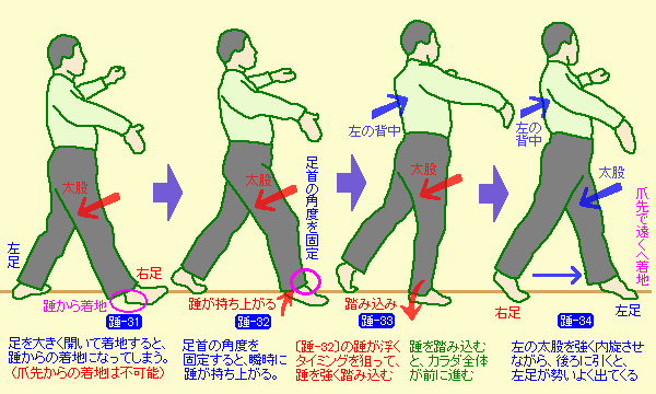 【踵-32)の、わずかに爪先が浮き上がるタイミングをみて、踵を踏み込んでやれば、左の背中が前に出て、気持ちよくカラダ全体が、前方へと進んで行きます【踵-33)。