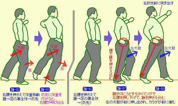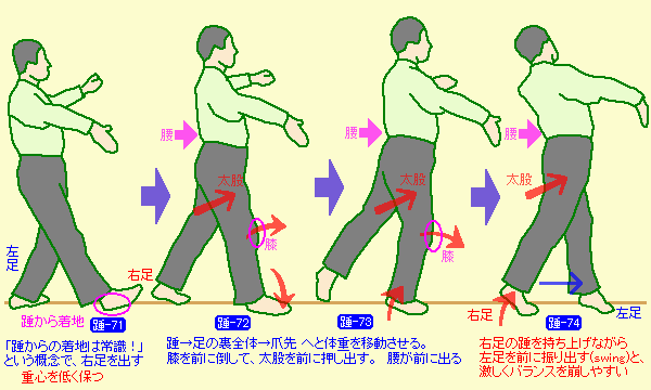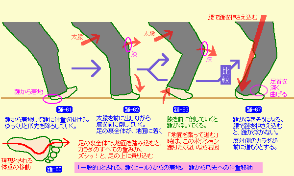 【踵-61)のように、踵から着地し、体重を踵から拇指球、爪先へと移していく。