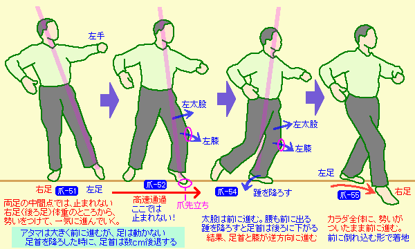 左の膝をどんどん前に倒していき、強い爪先立ち(最終的には、左足の親指の上に、カラダの全体重を乗せて立ちます)のところから、踵を降ろしていけば、前に進むのは簡単です【爪-32)。