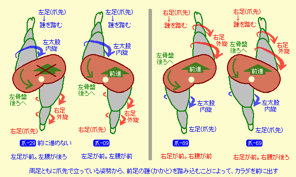 左の骨盤は後ろに下がろうとするが、左の骨盤は斜め前にあるので、後ろには下がらない。 結果的に、骨盤が動かない形で、静かにカラダが前に進んでいく。