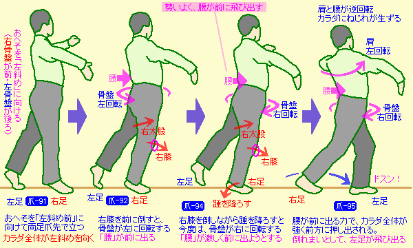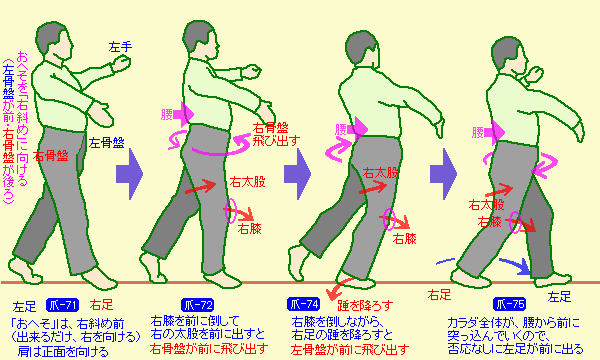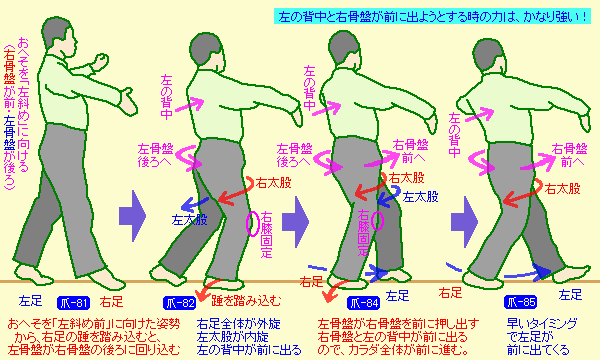 ここから、踵を降ろすと、骨盤は「激しく」右に回転する(爪-74) この骨盤の回転、とうより「左骨盤が勢いよく前に飛び出す」力によって、腰が勢いよく前に出る。