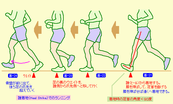 「ヒール着地」の走り方は、ごくごく自然な走り方だし、着地の際に、足を遠く(できる限り前方)に伸ばすことが出来るので、大きく進めるであろう。。。というメリットがあります。