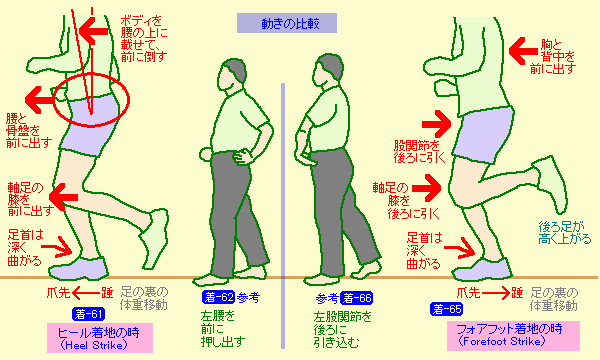 (着-61)のように、「ヒール着地」の基本は、「腰(こし)と骨盤を前に出すこと」だろうと思われます。