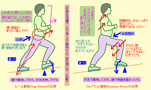上り坂に、爪先から拇指球あたりが軽く引っかけるようにして、「フォアフット着地」します。