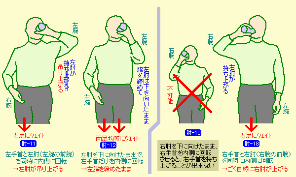 右手の場合は、手首と肘が同時に内側に回転し、肘は持ち上がります。