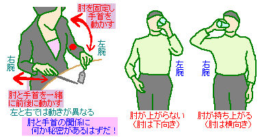 これを裏返しに言えば、それだけ「右手」と「左手」の肘や手首の動きの違いが、カラダの動き全体に、大きな影響を与える・・・・ということなのでしょう。
