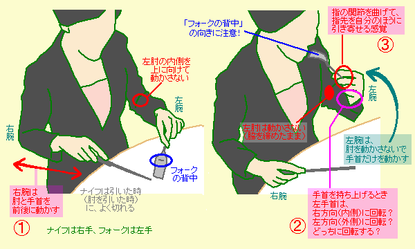 ・洋食のナイフとフォークで食事をするときの、左右の肘の動き。