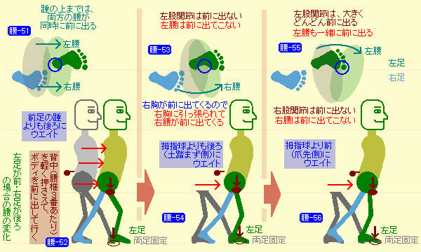 ウエイトが左足の踵の上に来る(腰-52)までは、両方の腰が同時に前に出て(腰-51)おへそは進行方向を向いています。