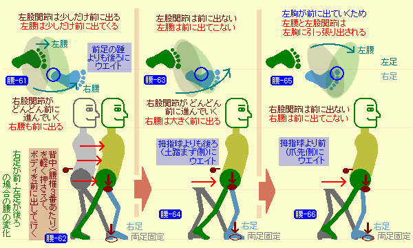 右腰は、右股関節に引っ張られるようにして、前に出ていきます(腰-61)(腰-63)