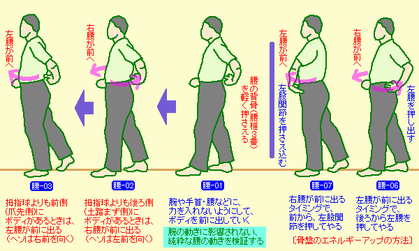 (腰-06)のように、右腰が前に出るタイミングで、後ろから左腰を押し出してやれば、カラダは勢いよく前に出ます。