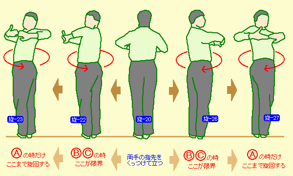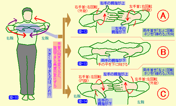 左への旋回(旋-23)でも、右への旋回(旋-27)でも、(A)=(両方の手首を右に回転)の方が、大きくカラダを旋回させることが出来ます。