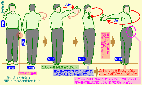 右腕の肘をカラダの正面に伸ばして、真っ直ぐに立ちます。(旋-30)(旋-31)