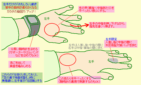 左手首に、サポーターでも、腕時計でも、ゴムバンドでも良いので、はめておきます。 カラダに動きがあったとき(足で地面を押さえたときなど)には、「左手首に右回転」が、無意識にかかります。