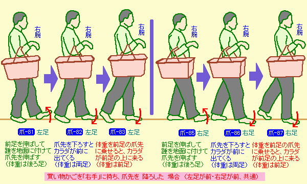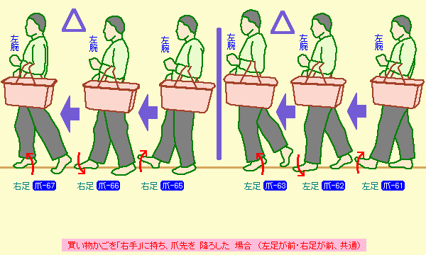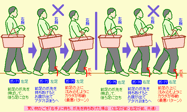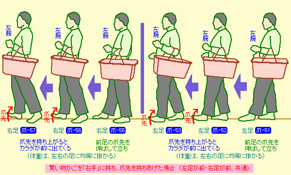 今度は、右手に「買い物かご」を持った時の体重移動。