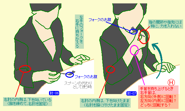 そこから、フォークを口元に運ぶわけですが、このとき、右手首に回転が掛かります。 右手首は左回転でしょうか? それとも右回転でしょうか?